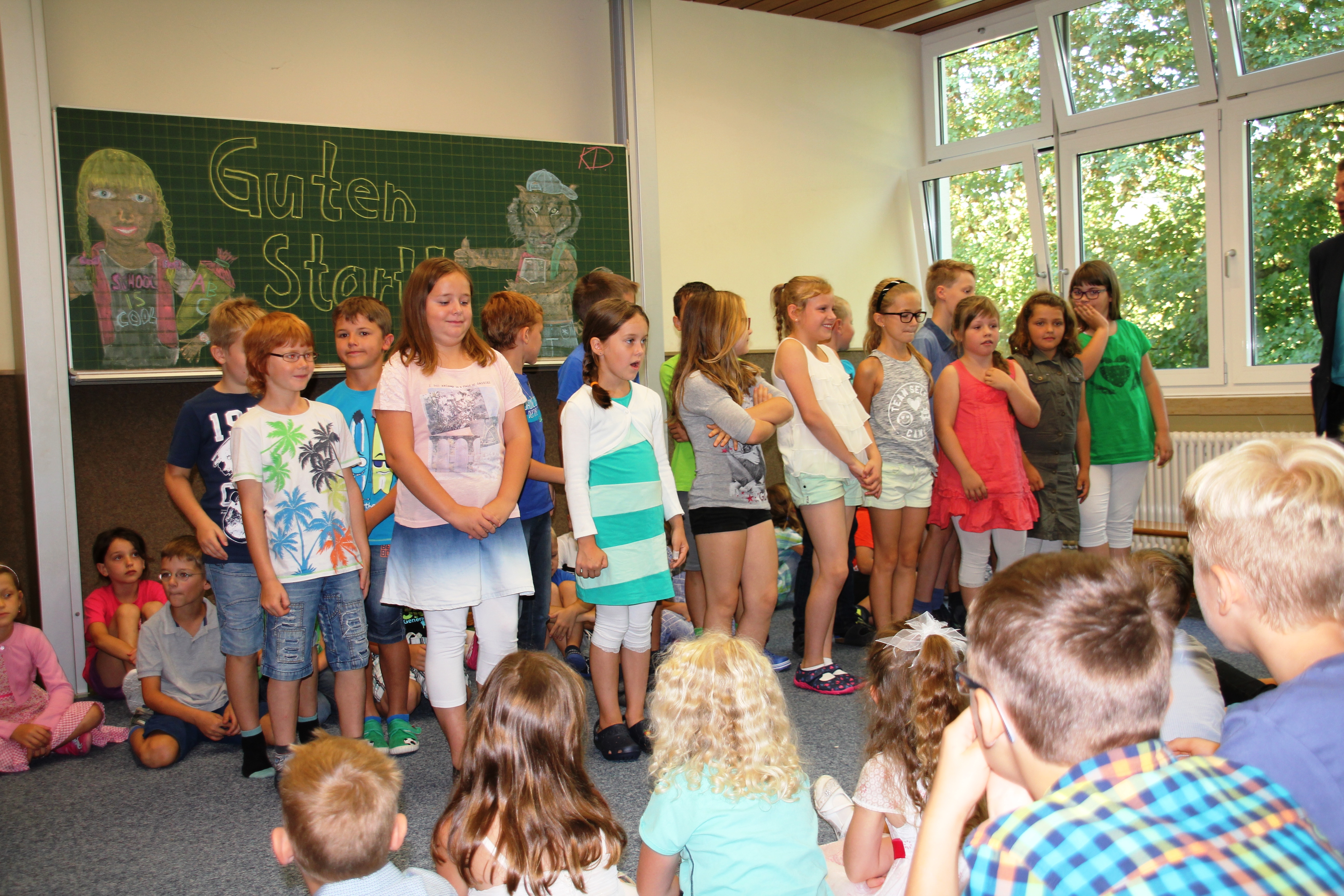 Nach dem → Anfangsgottesdienst traf sich die Schulfamilie zur großen Schulanfangsfeier im Turnraum, wo Rektorin Katja Prediger die neuen Erstklässler herzlich willkommen hieß und die einzelnen Klassen Beiträge vorbereitet hatten. Bürgermeisterin Gisela Hofmann gratulierte den ABC-Schützen und schenkte ihnen im Namen der Gemeinde die Königsfelder Schul-T-Shirts. Der Elternbeirat sorgte für Kaffee und Kuchen.