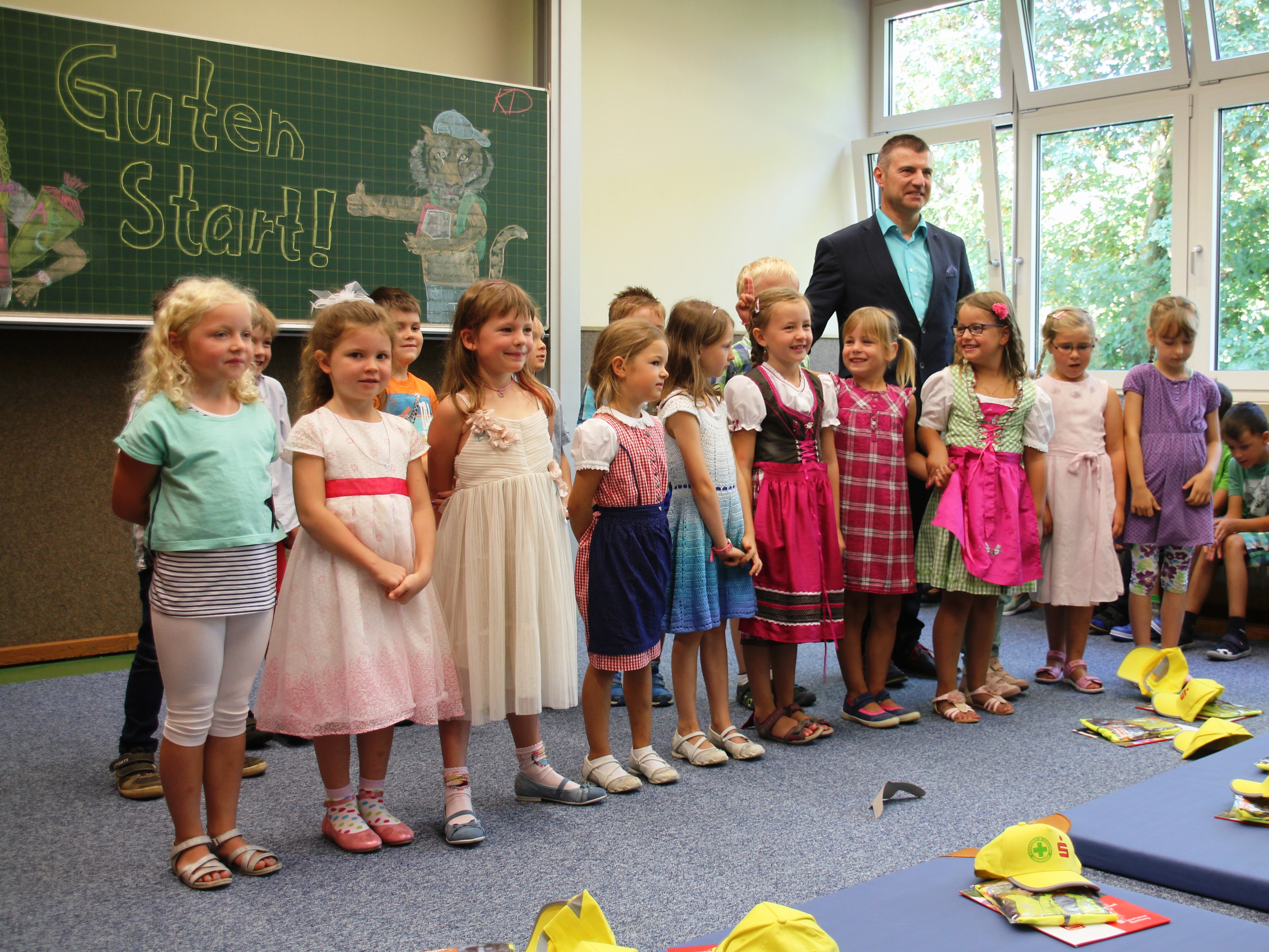 Der Anfang eines neuen Schuljahres ist für alle Schüler nach den großen Ferien ein besonderer Tag. Für die neuen Erstklässler ist der Erste Schultag außerdem ein ganz einschneidendes Ereignis. Aus diesen Gründen beginnen wir das Schuljahr mit einer Schulanfangsfeier in der Schule. Die Eltern der ABC-Schützen sind unsere Gäste. Schon gegen Ende des vorangegangenen Schuljahres bereiten die 2., 3. und 4. Klasse musikalische Beiträge für diesen Anlass vor. Neben der Rektorin Frau Prediger heißt auch der Bürgermeister die neuen Erstklässler willkommen. Zusammen übergeben sie den ABC-Schützen das Schul-T-Shirt mit dem Logo unserer Schule (Geschenk der Gemeinde Königsfeld) sowie für einen sicheren Schulweg gelbe Kappen und gelbe Reflektor-Westen (gesponsert von den lokalen Bankinstituten und der Verkehrswacht).
