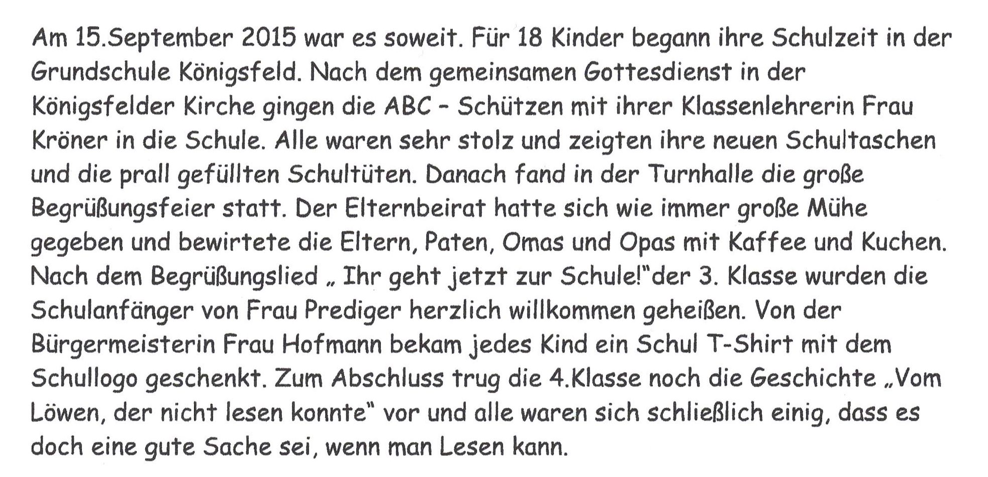 Nach dem Anfangsgottesdienst traf sich die Schulfamilie zur großen Schulanfangsfeier im Turnraum, wo Rektorin Katja Prediger die neuen Erstklässler herzlich willkommen hieß und die einzelnen Klassen Beiträge vorbereitet hatten. Bürgermeisterin Gisela Hofmann gratulierte den ABC-Schützen und schenkte ihnen im Namen der Gemeinde die Königsfelder Schul-T-Shirts. Der Elternbeirat sorgte für Kaffee und Kuchen.